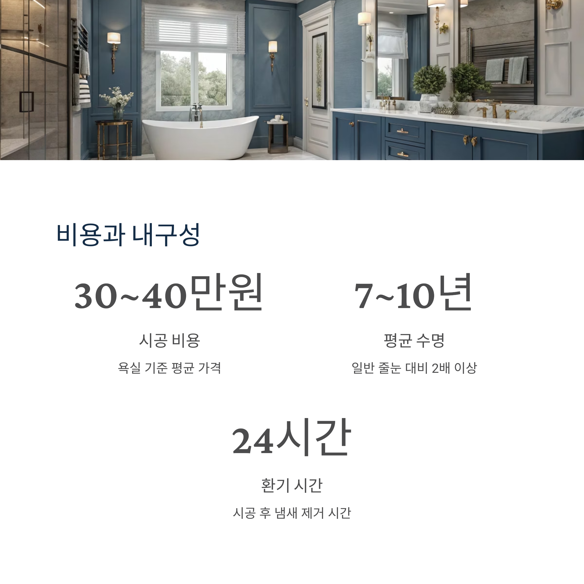 - 5. 긴 수명: 욕실 기준 7~10년 이상 유지 가능